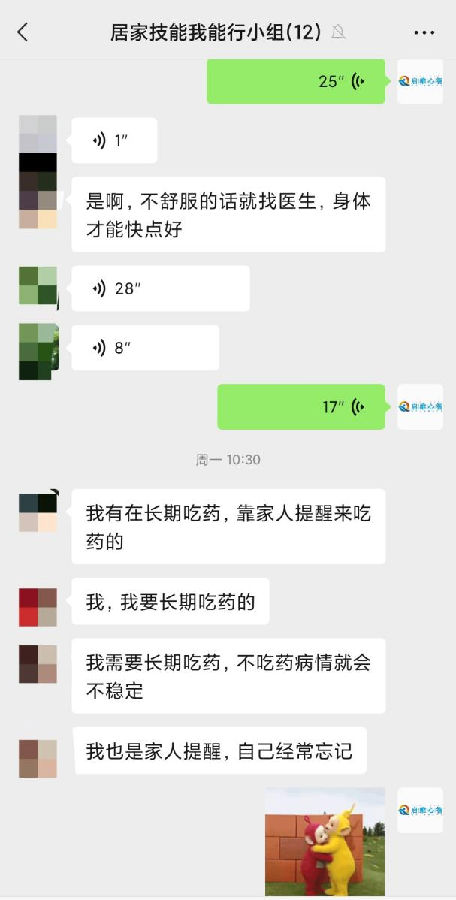 “我最闪亮”夸夸群 ——自我效能感提升小组 12月12日至16日,启维心智民政精综社工通过线上渠道组织开展了“我最闪亮——夸夸群”自我效能提升小组,旨在帮助组员提升自信心,形成积极正向的自我评价,树立“自尊、自信、自立、自强”的良好观念。 在每节小组开始之前,社工都以趣味性的游戏来调动组员积极性,为小组的开展营造轻松氛围。 第一节活动开始,社工鼓励大家以水果自述相互熟悉,将自己比喻成一种水果,讲述着自己代表的水果种类和类比理由,分享过程中十分有趣。 而后,所有组员分享了三个问题:“你做过什么特别的事?”“你有什么烦心事?”“你有什么想做却一直没有做的事?”组员们通过自我披露,讲述了自己的故事经历和内心想法,也各自分享了许多生活小技巧,倡导互相鼓励、夸赞,互相支持,学会以正面的、积极的、善意的表达去鼓励安慰他人,在这个过程中找到自信与认可。 适当的鼓励对我们的自信心提升有着积极作用,每个人都有闪光点,要善于发现它们的优点,不吝夸赞,做最闪亮的自己。 做自己的健康“守门人” ——居家康复小组 12月12日-17日上午,民政精综项目社工组织开展了6节线上居家康复技能学习小组活动,并邀请了七名服务对象及家属参与。小组旨在帮助服务对象及家属学习居家康复的技能,增强自我防御能力,帮助树立康复信心,迎接美好生活! 小组内容涵盖了居家康复中的服药习惯问题、药物副作用知识、疫情期间居家个人防护措施、沟通技巧等几大重点内容。尤其是针对疫情期间的特殊需求,分享了一些如何使用抗原试剂、感染后如何康复等“干货”内容,希望组员做好自己的“第一健康责任人”。 在邀请组员分享服药经验的环节,组员们对于服药管理颇具心得,相信坚持治疗是控制疾病的基石,懂得借助家人或者外界的力量帮助自己持续性服药,具有良好的服药意识。 随后,社工给组员们分享了新冠病毒的知识,通过分析新冠病毒病毒特性,传授个人防护措施以及感染后的居家康复指南,希望组员们有备无患。 在居家康复中,我们每个人都是自己健康的“守门人”,我们可以通过各种渠道调整自己的身心,发挥个体在康复中的主观能动作用,重新界定自己的价值,更好地拥抱生活!