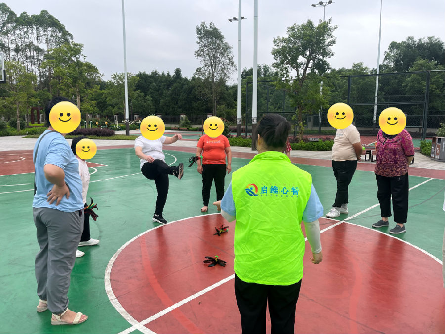 在社工的指导下,康复者们很快掌握了踢毽子的诀窍,他们用脚相互传毽子,沉浸在运动的快乐中。