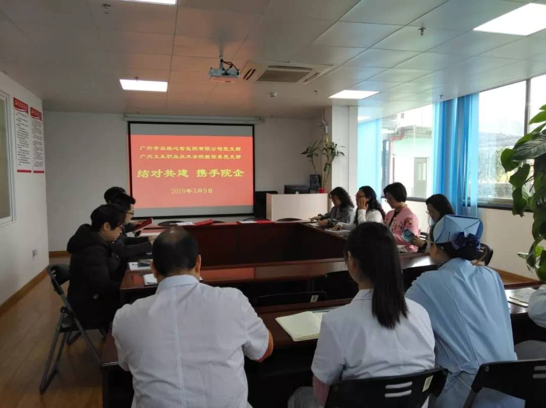 这标志着我院与广卫职院的交流合作将进一步深化。自2017年6月我院挂牌“广州卫生职业技术学院大学生创业教育基地”以来,我院就一直和卫职院师生在临床见习、志愿活动等方面保持良好的联系。此次的支部共建活动双方支部书记分别对各自支部情况做了详细的介绍,林东耳书记也针对我们院如何将精神专科服务与社工团队结合打造“社区、医院、家庭”服务模式进行介绍,并一起参观门诊、住院病区及社工活动室,双方在为学生更多提供临床见习和社会实践等达成共识。