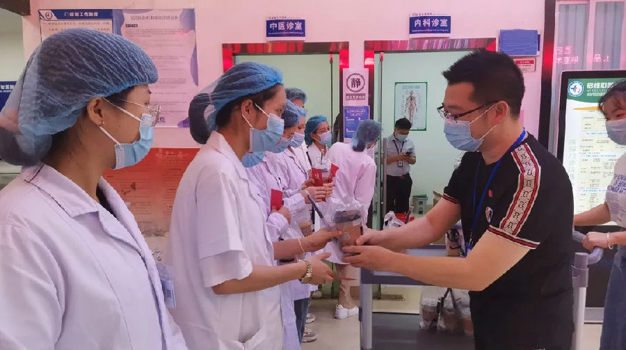 院领导在门诊处关爱问候坚守在岗位的医生们,向他们送上奶茶礼品和慰问金,感谢大家常年坚守在医疗一线所付出的辛劳,并叮嘱大家在疫情常态化防控阶段,做好医疗质量与安全的同时还要保重身体。院领导表彰了“先进工作者”医生,对他们的工作给予高度肯定和鼓励。