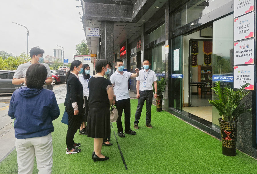5月24日下午,广州市民政局市管一级调研员龙少齐带队到中心实地调研考察天河区精神障碍社区康复服务项目工作,天河区民政局社会救助与福利科科长韩燕陪同,党支部书记林东耳及社工中心负责人参与接待。