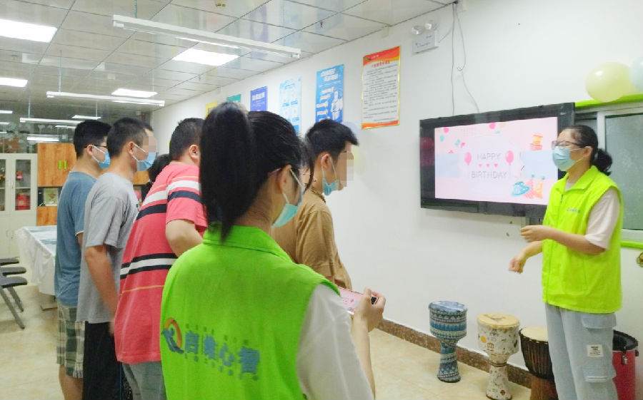在中途宿舍活动室内,社工们为寿星舍友精心布置了生日氛围,准备了蛋糕和零食,随着欢快的背景音乐响起,生日活动正式开始。