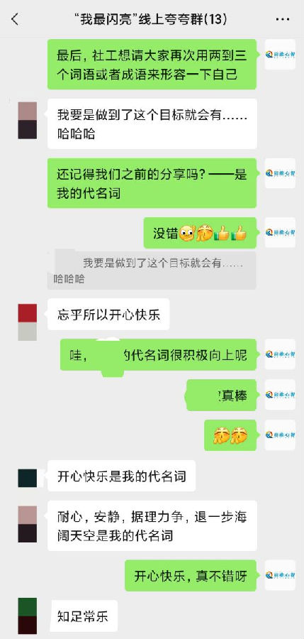 “我最闪亮”夸夸群 ——自我效能感提升小组 12月12日至16日,启维心智民政精综社工通过线上渠道组织开展了“我最闪亮——夸夸群”自我效能提升小组,旨在帮助组员提升自信心,形成积极正向的自我评价,树立“自尊、自信、自立、自强”的良好观念。 在每节小组开始之前,社工都以趣味性的游戏来调动组员积极性,为小组的开展营造轻松氛围。 第一节活动开始,社工鼓励大家以水果自述相互熟悉,将自己比喻成一种水果,讲述着自己代表的水果种类和类比理由,分享过程中十分有趣。 而后,所有组员分享了三个问题:“你做过什么特别的事?”“你有什么烦心事?”“你有什么想做却一直没有做的事?”组员们通过自我披露,讲述了自己的故事经历和内心想法,也各自分享了许多生活小技巧,倡导互相鼓励、夸赞,互相支持,学会以正面的、积极的、善意的表达去鼓励安慰他人,在这个过程中找到自信与认可。 适当的鼓励对我们的自信心提升有着积极作用,每个人都有闪光点,要善于发现它们的优点,不吝夸赞,做最闪亮的自己。 做自己的健康“守门人” ——居家康复小组 12月12日-17日上午,民政精综项目社工组织开展了6节线上居家康复技能学习小组活动,并邀请了七名服务对象及家属参与。小组旨在帮助服务对象及家属学习居家康复的技能,增强自我防御能力,帮助树立康复信心,迎接美好生活! 小组内容涵盖了居家康复中的服药习惯问题、药物副作用知识、疫情期间居家个人防护措施、沟通技巧等几大重点内容。尤其是针对疫情期间的特殊需求,分享了一些如何使用抗原试剂、感染后如何康复等“干货”内容,希望组员做好自己的“第一健康责任人”。 在邀请组员分享服药经验的环节,组员们对于服药管理颇具心得,相信坚持治疗是控制疾病的基石,懂得借助家人或者外界的力量帮助自己持续性服药,具有良好的服药意识。 随后,社工给组员们分享了新冠病毒的知识,通过分析新冠病毒病毒特性,传授个人防护措施以及感染后的居家康复指南,希望组员们有备无患。 在居家康复中,我们每个人都是自己健康的“守门人”,我们可以通过各种渠道调整自己的身心,发挥个体在康复中的主观能动作用,重新界定自己的价值,更好地拥抱生活!