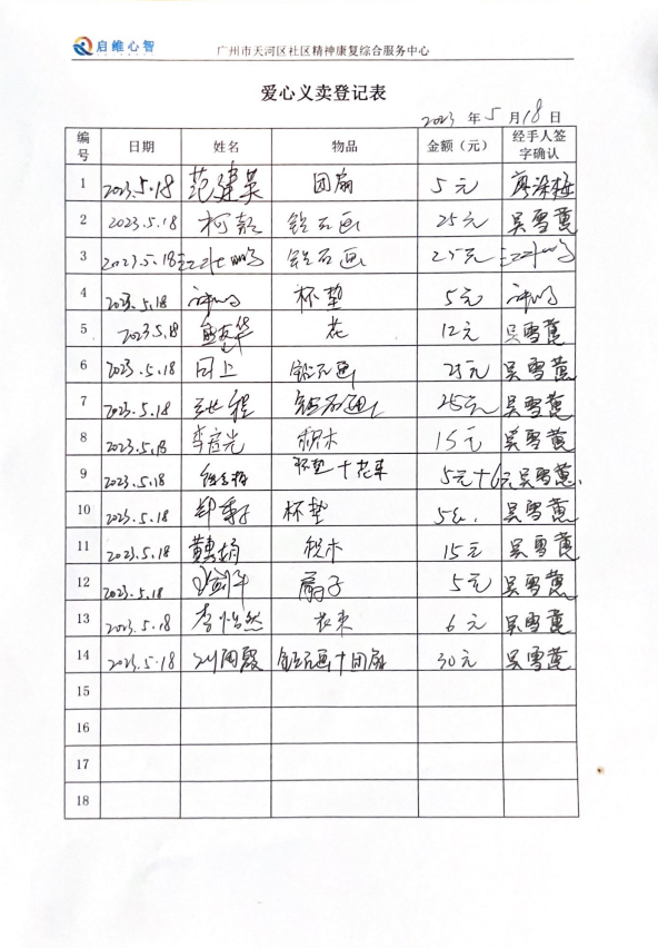 此次作品爱心义卖得到了众多社区居民的支持,天河精综在此向为精神残疾人提供帮助与支持的社区居民表示衷心的感谢!此次爱心义卖所得的款项将全部用于困难精神残疾人帮扶。