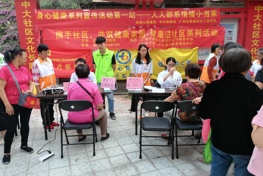 2018年11月14日上午,启维心智医院与广州市启维心智社会工作服务中心、广州市新港街社工服务站携手在新港街中大社区居委会内开展了一场名为“身心健康系列宣传活动——人人都系情绪小当家”的义诊活动。旨在为社区居民的情绪问题答疑解忧,促进社区居民对自身的身心健康的了解与管理,提高社区居民对精神卫生健康的认识。本次义诊活动吸引了100多名社区居民前来参加。