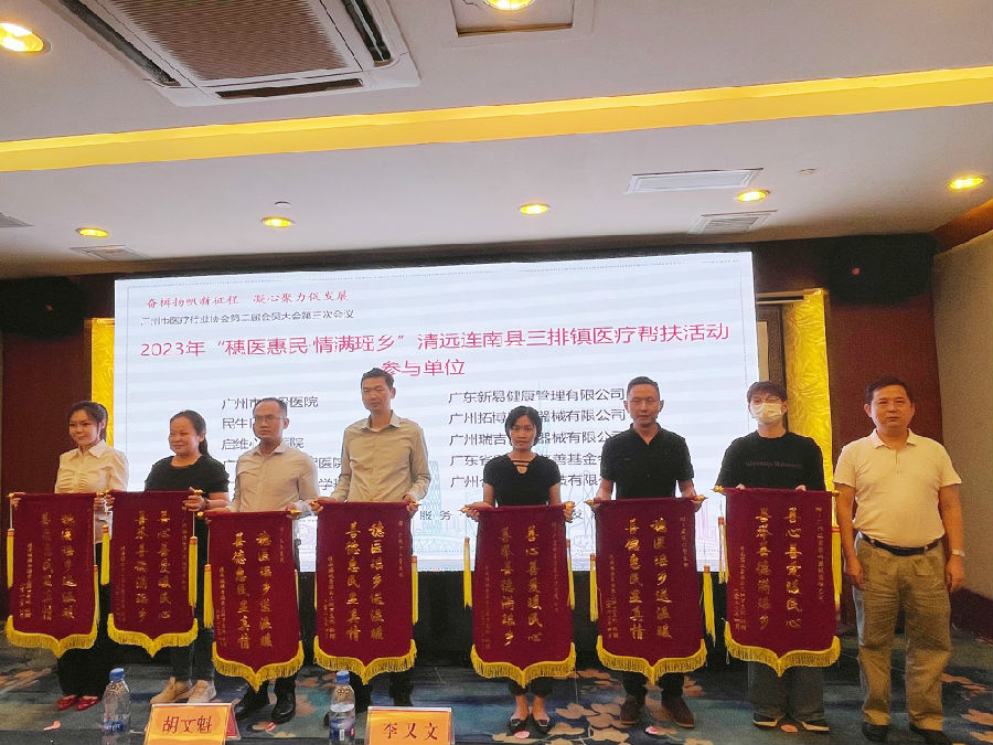 现场,为积极参与“穗医惠民·情满瑶乡”清远市连南县三排镇医疗帮扶活动的单位颁发牌匾、证书及锦旗,我院作为帮扶单位接受三排镇卫生院赠旗。
